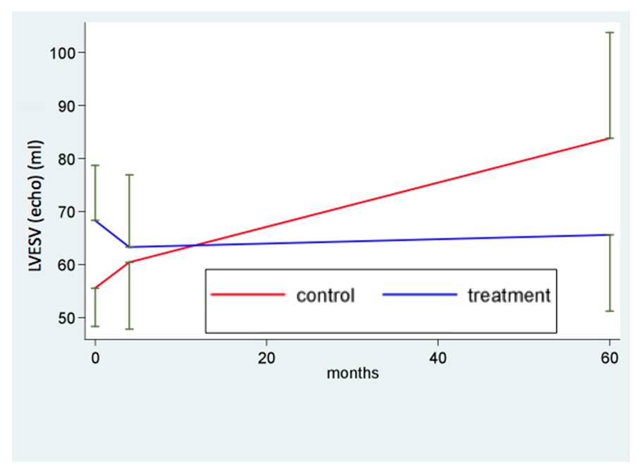 LVESV – ml Baseline 4 months 60 months | 56 (14) 60 (23) 84 (30) | * 28.3 (10.4; 46.2); p = 0.003 ^ 4.8 (–7.8; 17.6); p = 0.43 ‡ 23.4 (6.5; 40.3); p = 0.01 | 68 (24) 63 (32) 66 (32) | * –2.6 (–17.8; 12.5); p = 0.72 ^ -5.1 (–12.7; 2.7); p = 0.19 ‡ 2.3 (–10.1; 14.7); p = 0.70 | * 31.0 (7.8; 54.1); p = 0.010 ^ 11.1 (–2.2; 24.4); p = 0.04 ‡ 21.3 (0.5; 42.1); p = 0.05 |