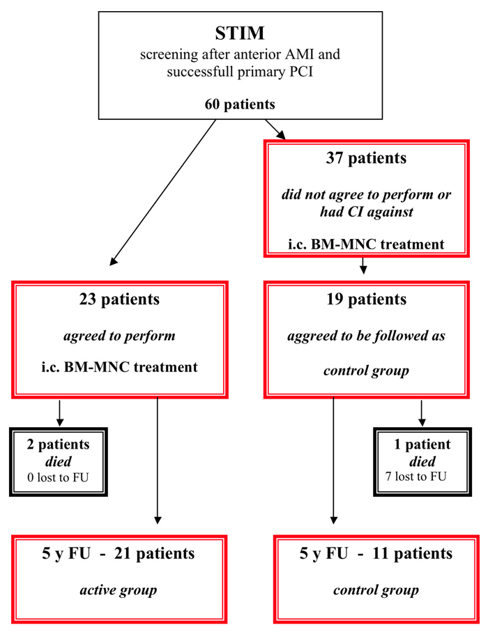 We aimed to evaluate long-term (5 years) efficacy results of Stem Cell Transplantation in Ischaemic Myocardium trial (STIM), a single centre trial including patients with recent AMI treated by intracoronary BM-MNC administration.