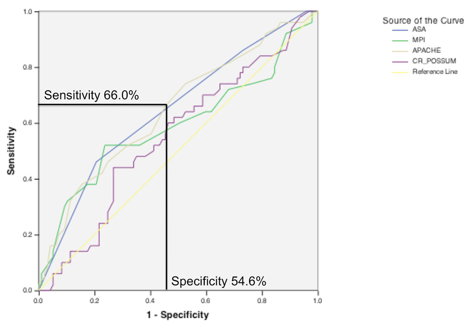 Table 4: Non-survivors showed significantly higher MPI, APACHE II, and CR-POSSUM scores than survivors. | |||