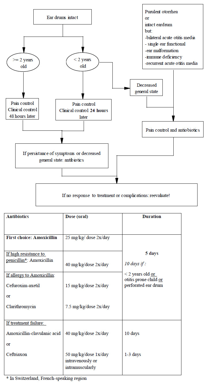 According to the Pediatric Infectious Diseases Group of Switzerland ( http://www.pigs.ch ), which includes all paediatric infectious diseases specialists of Switzerland, recommendations for the treatment of acute otitis media in this country are summarised in (fig. 1).