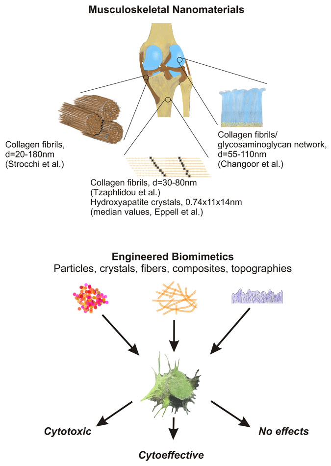Musculoskeletal tissues – the prototypes of nanomaterials. The structural composition of ligaments/ tendons, bone and cartilage is very similar, although these tissues have quite a distinct appearance. In a simplified approach they consist of a characteristic network of collagen fibrils with diameters of approximately 100 nm embedded within a tissue specific matrix. Appropriate engineering of nanobiomaterials making use of particles, crystals, fibres, composites or surface topographies may lead to biomimetic constructs that exhibit a favourable inductive interplay with the host cells and tissues. Detailed and standardised investigations are necessary to predict the cellular and organ reaction upon exposition to those nanomaterials. (References: Strocchi R et al. Ital J Anat Embryol. 1996;101(4):213–20. Changoor A et al. Osteoarthritis Cartilage. 2011;19(12):1458–68. Tzaphlidou M et al. Micron. 2005;36:593–601. Eppell S et al. J Orthop Res. 2001;19:1027–34.)