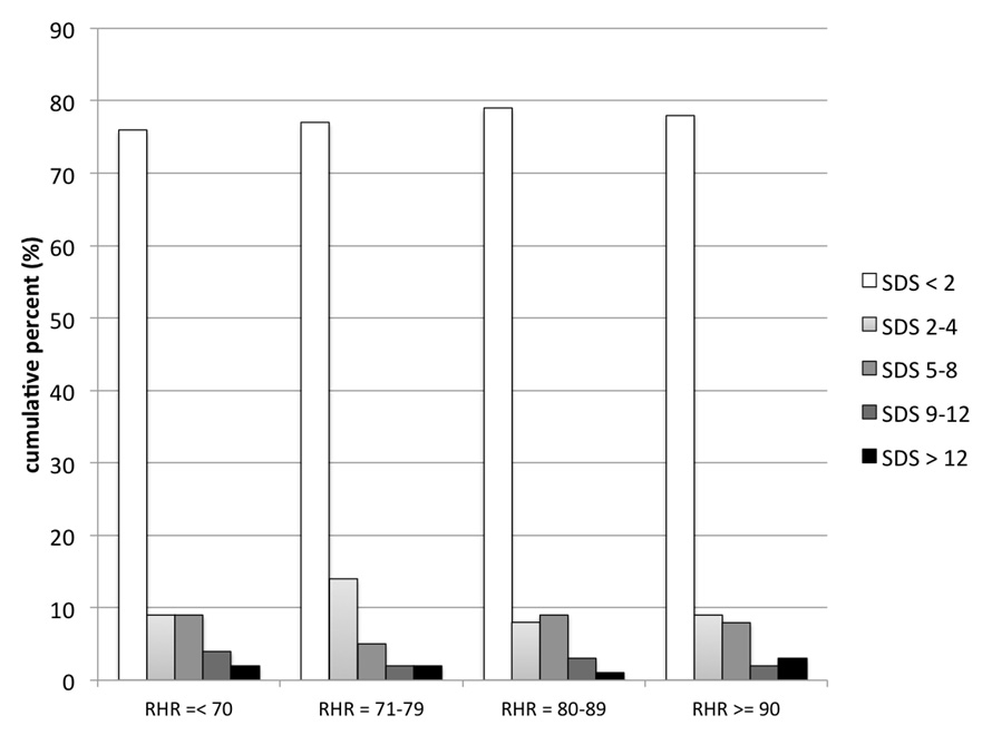Graphics illustrating the interrelation between the quartiles of resting heart rate (RHR in bpm) and the severity of myocardial ischaemia (SDS),
