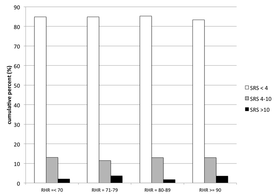 Graphics illustrating the interrelationship between the quartiles of resting heart rate (RHR in bpm) and the extent of myocardial scar (SRS) as assessed by MPS. Note that RHR was related neither to severity of myocardial ischaemia (p = 0.798), nor to the extent of myocardial scar (p = 0.869).