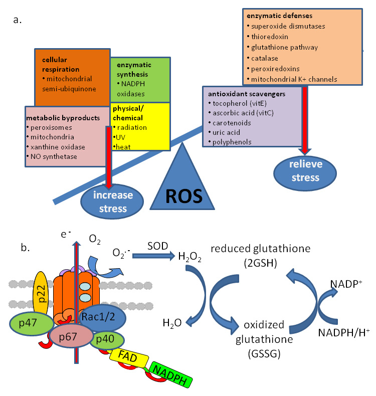 (a) ROS generation and degradation contributing to the oxidative balance. (b) The NOX2/p22phox complex, consisting of NOX2 (orange) and the subunits p47, p67, and p40 (left) and glutathione defense mechanism (right). The superoxide (O2 .–) generated by the NOX complex is rapidly dismutated by superoxide dismutatase (SOD), where it can enter the glutathione synthesis and recuperation cycle.