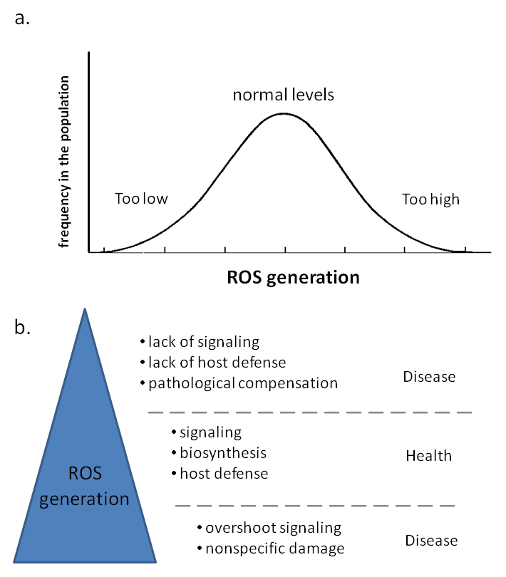 Variations of ROS generation. (a) Conceptual representation of genetically-determined ROS generation in the human population. Globally, there are significant variations of ROS generation. Note, however, that there is also regulation of ROS generation by epigenetics and external influences. (b) At moderate levels, NOX have crucial roles in health through mechanisms including signaling, biosynthetic processes, and host defence. When ROS levels are too low, the condition may result in decreased antimicrobial defence (e.g. chronic granulomatous disease), hypothyroidosis, low blood pressure or loss of otoconia. When levels are too high, there is increased cardiovascular disease, neurological disorders, cancers, and chronic inflammation.