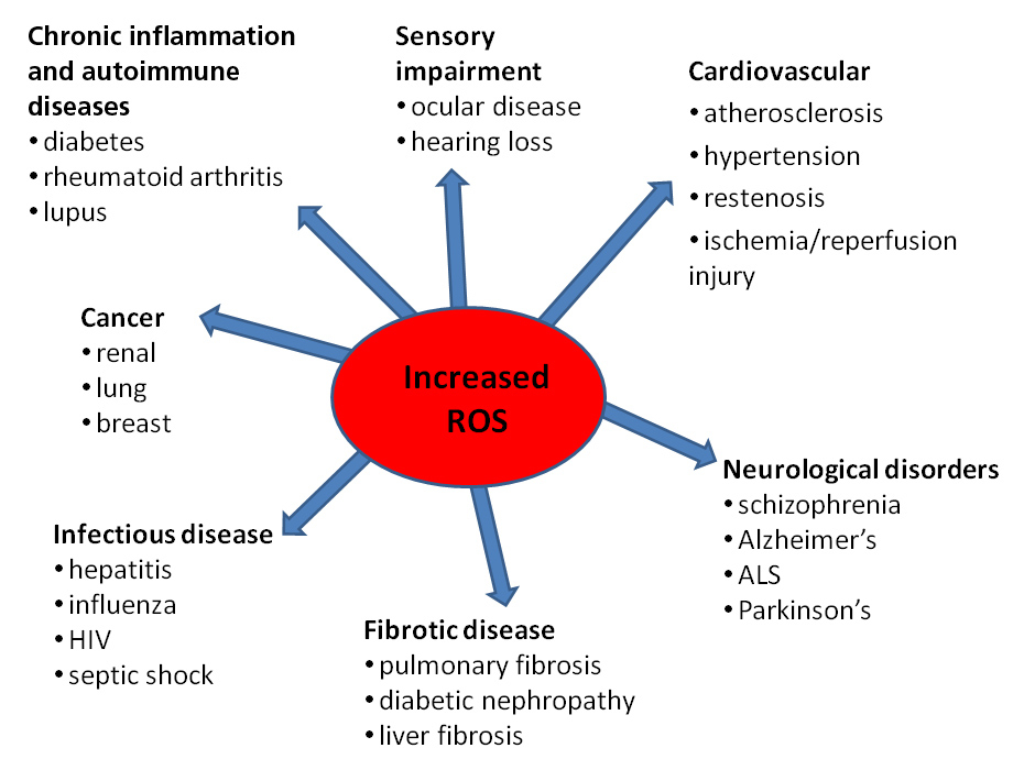 ROS contribute to a wide range of pathologies and many of the implicated diseases are leading causes of death (fig. 4). Cancers, cardiovascular diseases, and neurological diseases all show robust evidence for ROS involvement (table 1).