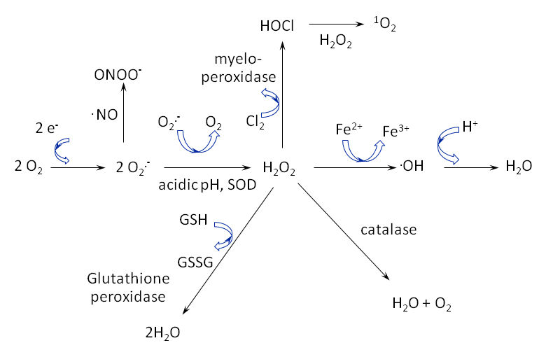ROS can be neutral molecules (eg. hydrogen peroxide), ions (e.g. superoxide anion) or radicals (e.g. hydroxyl radicals). Due to their reactivity, ROS are observed as a cascade of transitions from one species to another (fig. 2). Typically the initial reaction is a one electron transfer to oxygen to form superoxide (O2 .–), which then dismutates (spontaneously or catalysed by superoxide dismutase) to hydrogen peroxide (H2O2). Superoxide does not readily cross membranes and is short-lived and local in its effect, but superoxide dismutase converts superoxide to longer-lasting and membrane-diffusible hydrogen peroxide (H2O2) [12]. When superoxide reacts with nitric oxide (NO), the highly reactive peroxynitrite (ONOO–) is formed. Peroxidases catalyse reactions involving hydrogen peroxide, resulting in the generation of hypochlorous acid (HOCl) and singlet oxygen (1O2), among other species. Finally, the Haber-Weiss reaction uses an iron ion catalyst to generate hydroxyl radicals from superoxide and hydrogen peroxide.