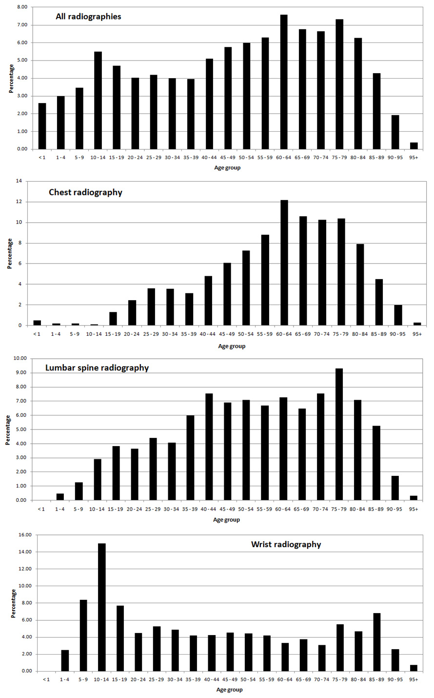Patient age distributions for all radiological examinations and specific for chest, lumbar spine and wrist, extracted from the 2008 data of CHUV.