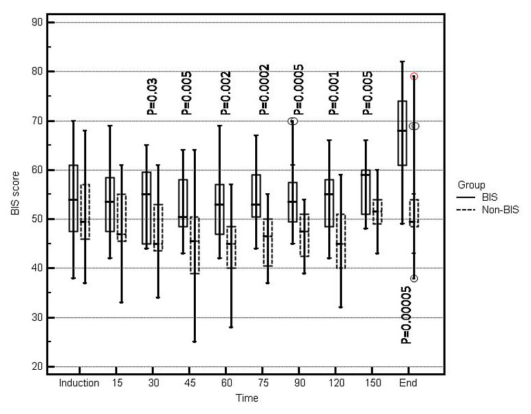 Comparison of BIS score at different time points during surgery between groups of patients with BIS-guided and non BIS-guided anaesthesia. Significant differences are marked and p values are given.