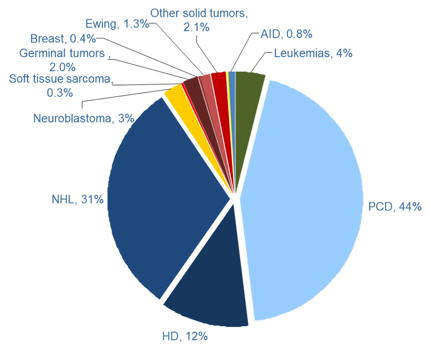 The most frequent indications for autologous HSCT in Europe are plasma cell myeloma (PCM), non Hodgkin lymphoma and Hodgkin lymphoma (HL). Whereas most patients with PCM receive autologous HSCT as part of the upfront treatment strategy, the majority of patients with NHL and in particular HL receive this treatment once they have relapsed after chemotherapy. Smaller numbers of autologous transplants are performed to treat solid tumours (germ cell tumours and solid tumours of childhood, such as neuroblastoma or Ewing sarcoma). Finally, about 150 autologous transplants are performed each year for autoimmune disorders [11–16].