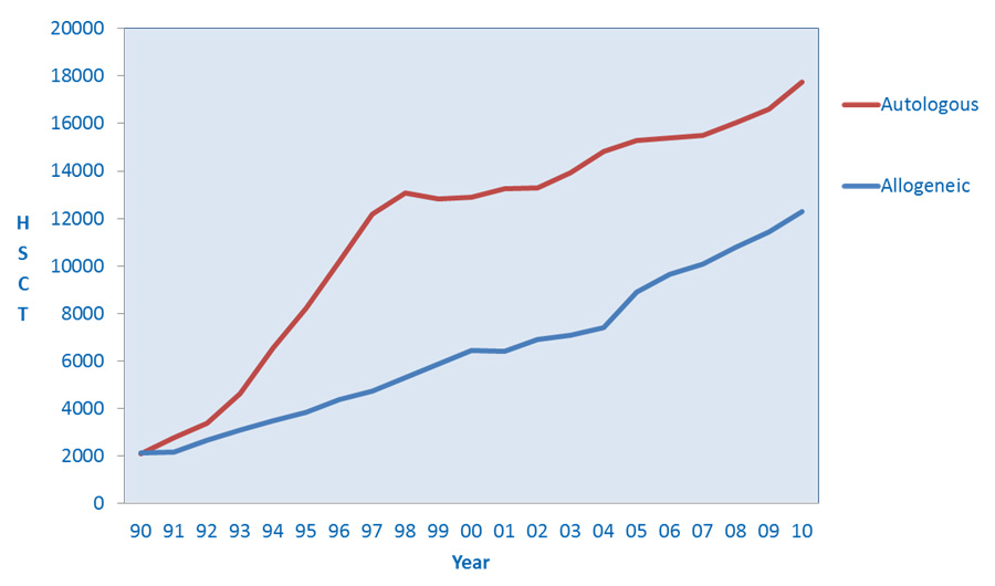 Replacement of the hematopoietic system, either in the form of hematopoietic stem cells from the patient themself (autologous hematopoietic stem cell transplantation; HSCT) or from another person (allogeneic HSCT), is a procedure that was used for the first time in man almost 45 years ago. Autologous HSCT is used to bridge hematopoietic failure during high dose chemotherapy for the treatment of tumours of the hematopoietic system that are adequately sensitive to this treatment. In this sense autologous stem cell support is not a "trans-plant" but the term autologous HSCT is commonly used. Results of both of these procedures are often reported together as they use similar technology. Allogeneic HSCT is used to replace the hematopoietic system in patients with acquired or congenital failure, and more commonly to exploit the graft versus tumour effect of allogeneic cells [1–2]. According to the European Group for Blood and Marrow Transplantation 2010 annual survey, 33,362 transplants were performed [3]. Of these 33,362 transplants, 13,345 were allogeneic and 20,017 autologous. Figure 1 shows the evolution of transplant numbers with a continuous increase from 1990 to 2010. Two major changes in clinical practice are mirrored in the curves displayed: The fist was the introduction of Imatinib (1999) for the treatment of chronic myeloid leukaemia (CML) resulting in a transient slowing of transplant numbers in the early 2000s. The second is the discontinuation of autologous HSCT for breast cancer after the publication of negative data.