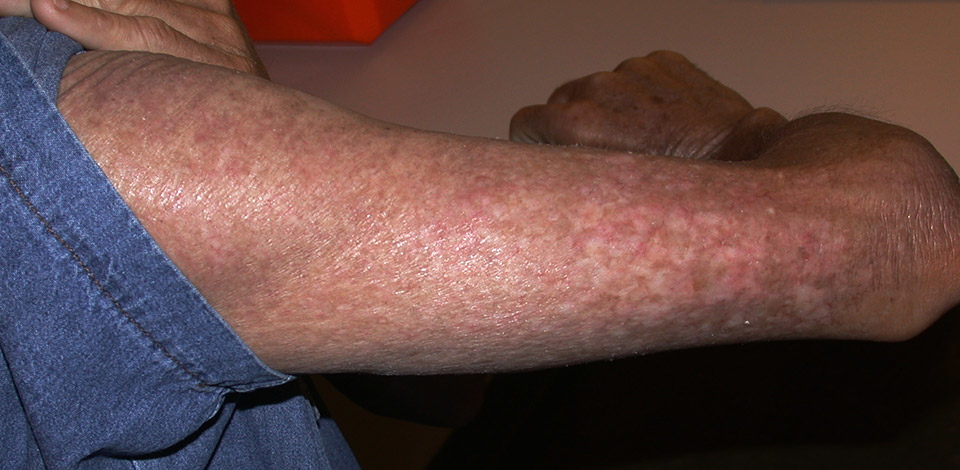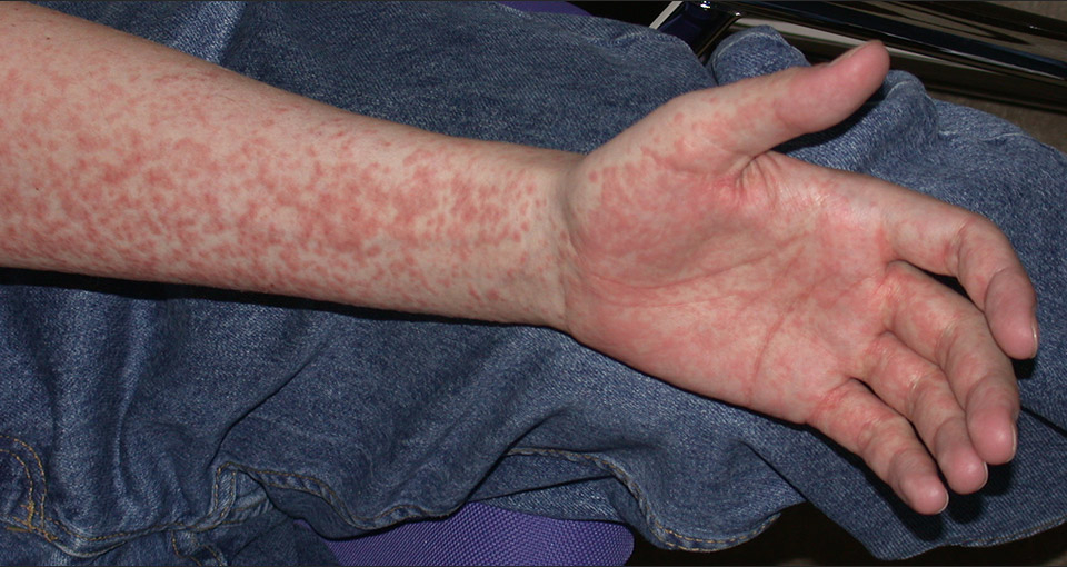 Morbilliform exanthema of acute GvHD of the skin including the palma manus.