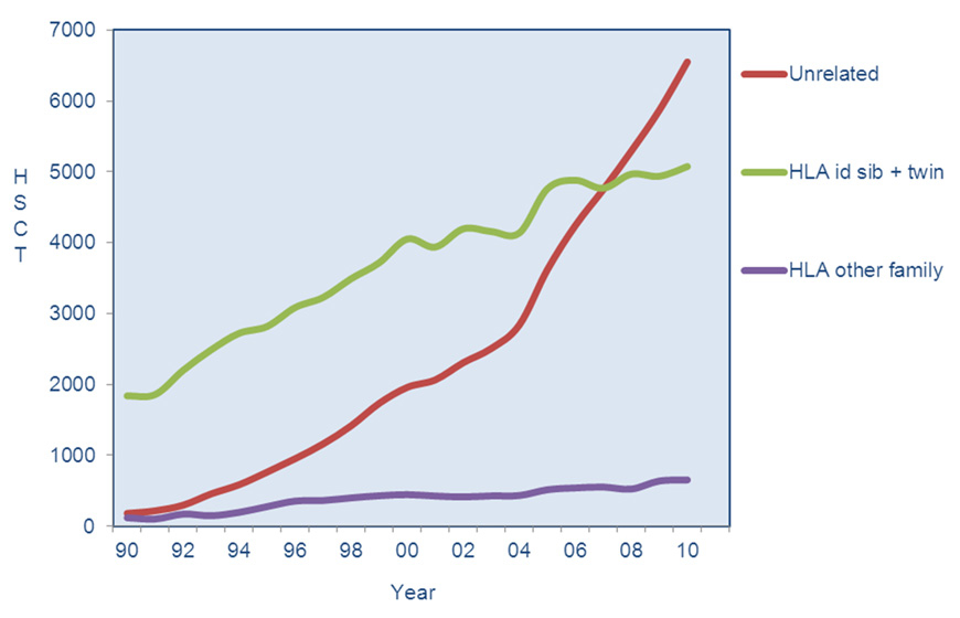 Use of different donor types for allogeneic HSCT in Europe 1990–2010 (reprinted from: Passweg JR, Baldomero H, Gratwohl A, Bregni M, Cesaro S, Dreger P, et al.; for the European Group for Blood and Marrow Transplantation (EBMT). The EBMT activity survey: 1990–2010. Bone Marrow Transplant. 2012;47(7):906-23 [3]).