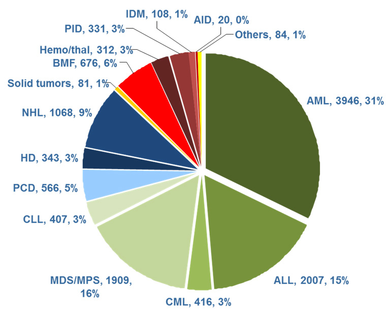 Abbr: AML Acute Myeloid Leukaemia, ALL Acute Lymphoblastic Leukaemia, CML Chronic Myeloid Leukaemia; MDS/MPS Myelodysplastic Syndromes/Myeloproliferative Neoplasias, CLL Chronic Lymphocytic Leukaemia, PCD plasma cell disorders, HD Hodgkin Lymphoma, NHL Non Hodgkin Lymphoma, Hemo/thal Hemoglobinopathies/Thalassemias, BMF Bone Marrow Failure, PID Primary Immunodeficiencies, IDM Inborn Errors of Metabolism, AID Autoimmune Disorders