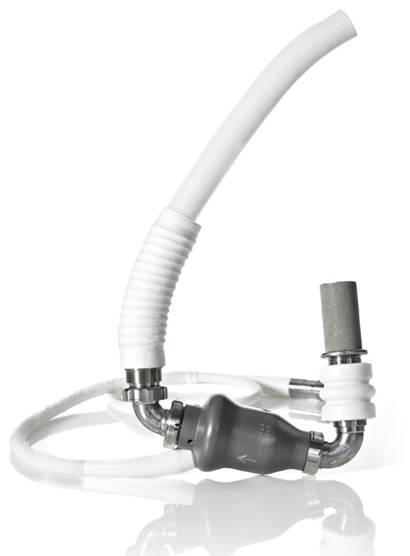 The blood flow is not axial because inflow and outflow axes are arranged in a 90° angle. Moreover this pump runs with lower rotation speed of 1000 to 2500/min. The small, wearless pump weighs 140 grams. The pump has one moving part, called an impeller, which spins blood to generate up to 10 l/min. flow. The small size of the pump allows intra-corporeal implantation within the pericardial cavity. The pump is connected to the controller via a thin driveline which is tunnelled through the abdominal muscle and leaves the body in the upper right quadrant of the abdomen. While active patients will always use two batteries, patients sleeping or relaxing should use power from an electrical outlet (AC adapter).