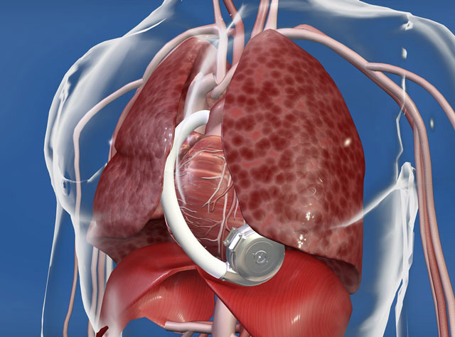 Years ago, the first LVAD systems were powered by large, extracorporeal units, and patients could only be partially mobilised: most often they remained hospitalised until transplantation. In contrast to the first generation of pulsatile, mostly pneumatic pumps, substantial development has led to the construction of non-pulsatile, miniaturised rotational pumps. Among them, the HeartMate II LVAS received FDA approval for the destination indication in January 2010, after obtaining FDA approval for “bridge to transplantation” in April 2008. This system is an intracorporeal pump with an axial flow pattern. The size of this pump has been significantly reduced compared to the previous pulsatile systems. The pump is driven by a rotating magnetic levitated impeller and has a capacity of up to 15,000 rotations/min, resulting in a theoretical maximal blood flow of 8–10 l/min. The pump has a weight of 300 g and is connected to the apex of the left ventricle and to the ascending aorta through a vascular graft return. This type of system is considerably quieter than the pulsatile one. It allows a fast mobilisation of patients and almost always a subsequent long term ambulatory rehabilitation.