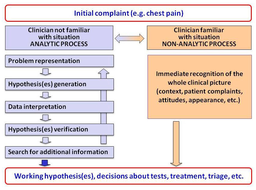 Schematic representation of the dual process of reasoning including immediate recognition of clinical picture (non-analytic process, right boxes) and hypothetico-deductive process (analytic process, left boxes). There is a high level of interaction between both processes in practice.