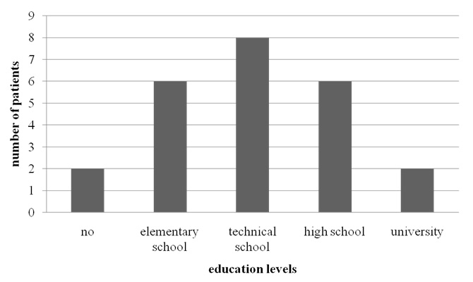 Education level of the participating patients. Eight patients had a high education level (high school or university degree), while most patients (n = 16) had an elementary school degree or a technical school degree.