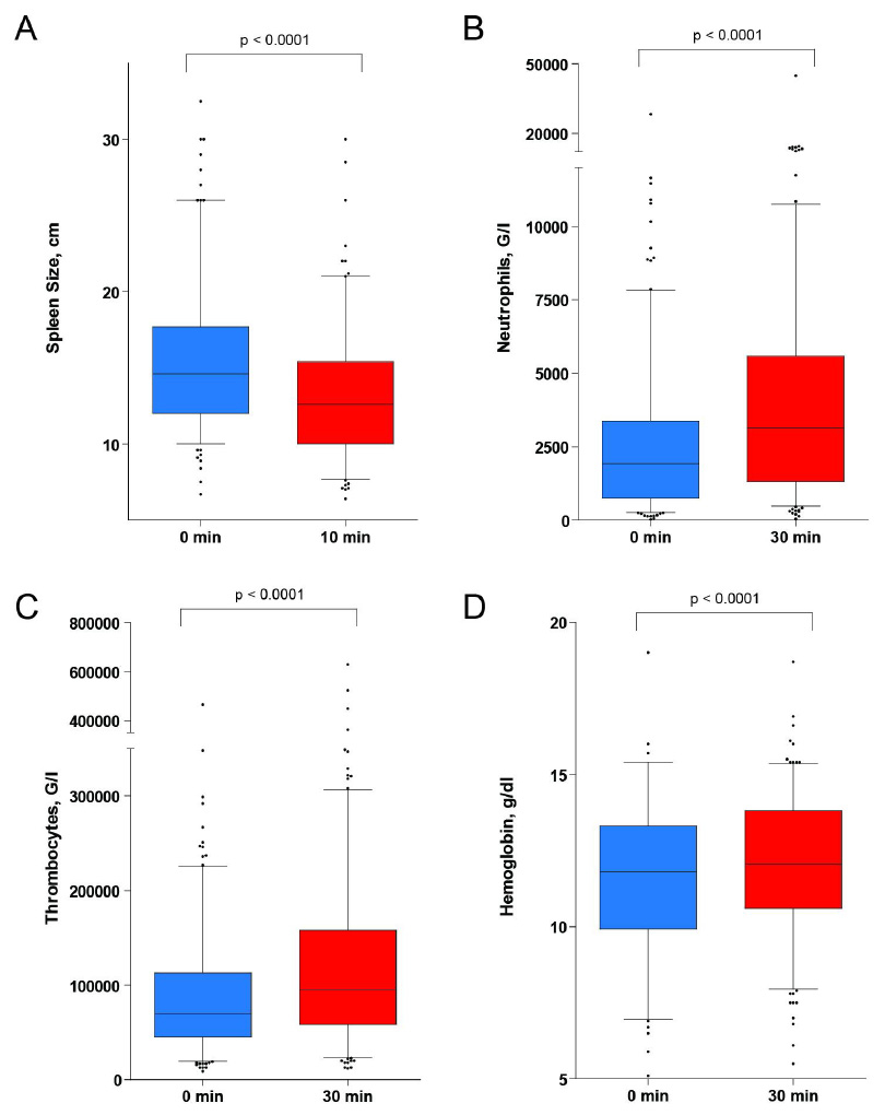 We compared relative changes in cell counts in both patient groups during EST and noted a significantly stronger platelet and neutrophil response for splenomegaly patients compared to patients with a normal spleen size (p = 0.0046 and p = 0.001, respectively, fig. 2A).