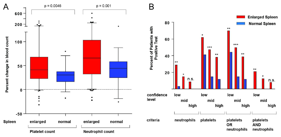An increase in platelet counts above the respective cutoff levels was frequently observed in splenomegaly patients, consistent with a high sensitivity of this criterion. However, the high number of positive tests at least for the low confidence evaluation suggests a limited specificity. In contrast, positive test results for changes in neutrophils occurred infrequently in patients with normal size spleens.