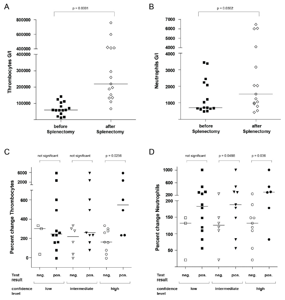 EST results were predictive of increases in neutrophil and platelet counts after splenectomy. We stratified patients according to EST results (fig. 3C, D). With the least stringent criteria for EST evaluation, we did not notice any differences between patients with positive and negative EST. In contrast, with criteria of high confidence, patients with positive test results showed stronger improvement in cell counts than patients with negative test results. This increase was significant for changes in platelet counts (p = 0.0256) and neutrophils (p = 0.036). Significance also remained intact in the whole splenectomy group including the 8 patients with ITP (data not shown). Using criteria of intermediate confidence, significant differences were only observed for changes in neutrophil counts (p = 0.0488). Taken together, EST results are significantly related to changes in cell counts after splenectomy.