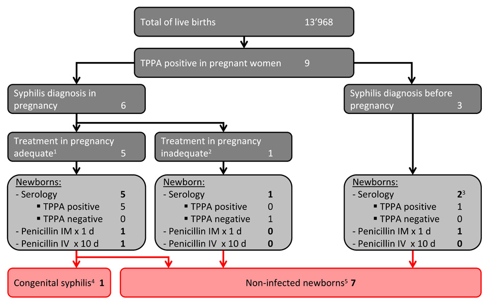 In Zurich, the Triemli Hospital Zurich is an urban hospital with approximately the seventh largest maternity unit in Switzerland providing increasing numbers of live births (from 1,246 in 2000 to 1,654 in 2009). In all pregnant women who gave birth in Triemli Hospital Zurich, those with conducted syphilis serology were further analysed and only cases with a positive serology were included in the study. Women were defined as seropositive if the T. pallidum Particle Agglutination assay (TPPA) was positive at any time during pregnancy. In most cases in which TPPA was positive, the Veneral Disease Research Laboratory test (VDRL), the Fluorescent Treponemal Antibody-Absorption test (FTA-ABS), and an IgM enzyme immunoassay (EIA) test (Pathozyme Syphilis M Capture) were performed. We evaluated the clinical management and analysed the outcome of the neonates born to these mothers by review of the patient's medical records. The study was approved by the ethics committee of Zurich (Study No. 2009-0050/0).