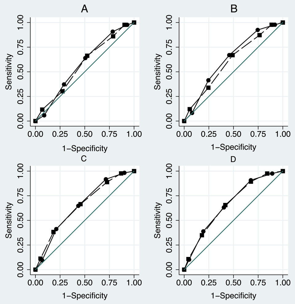 ROC curves of the Identification of Senior at Risk (ISAR – plain circle line) and the Triage Risk Stratification Tool (TRST- long-dash square-line) for readmission at 1, 3, 6 and 12 months.