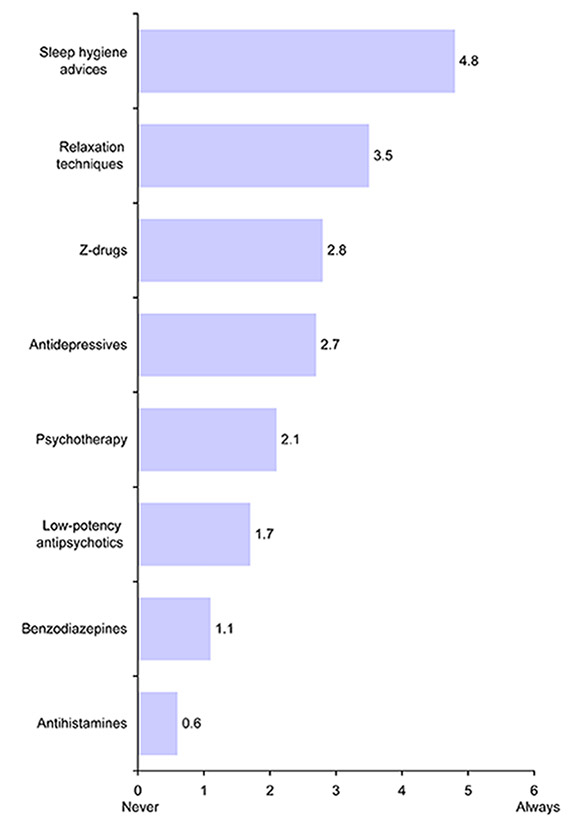 As shown in figure 1, relaxation techniques and sleep hygiene advice were the most common types of treatment for insomnia. However, Z-drugs were the most prescribed pharmacological interventions and benzodiazepines were used much less frequently.