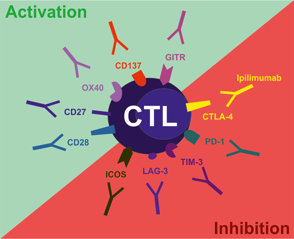 Examples of co-stimulatory and co-inhibitory molecules on T cells suitable for targeting with agonistic and blocking antibodies, respectively. CTLA-4, cytotoxic T lymphocyte antigen-4; PD-1, programmed cell death 1; TIM-3, T cell immunoglobulin and mucin domain-containing protein 3; LAG-3, lymphocyte activation gene 3; ICOS, inducible T cell co-stimulator; GITR, glucocorticoid-induced TNF family related gene; CD, cluster of differentiation.