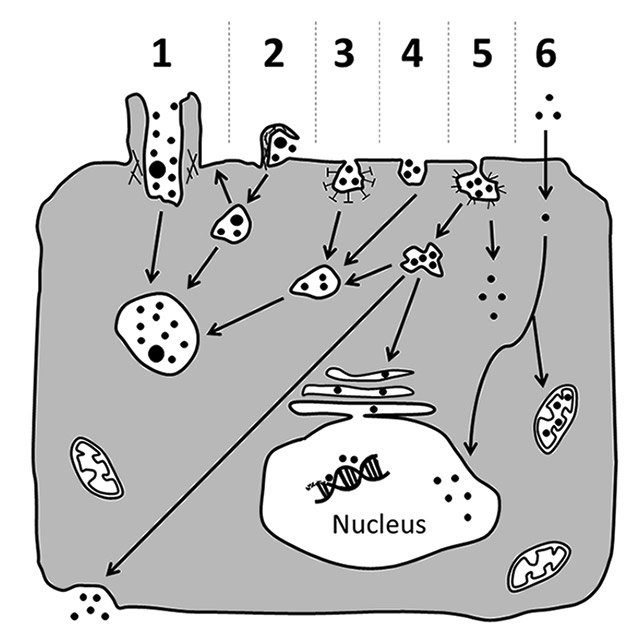 Possible mechanisms for cellular uptake of nanomaterials and their subsequent intracellular trafficking. Nanomaterials may be actively incorporated via phagocytosis (1), macropinocytosis (2), clathrin-dependent endocytosis (3), clathrin- and caveolae-independent endocytosis (4) or caveolae-mediated endocytosis (5). Particles that were internalised via active uptake are commonly transported in vesicular structures that then fuse to phagolysosomes or endosomes (1–5). Sometimes, they might be exocytosed upon macropinocytosis (2). Alternatively, they may also be carried to the cytosol, or be transported via caveosomes to the endoplasmic reticulum, or cross the cell as part of transcytotic processes (5). Besides active transport, nanoparticles may also enter the cell passively via diffusion through the plasma membrane (6). From the cytoplasm they may then gain access to subcellular compartments such as the nucleus and mitochondria (6). However, further research is needed to clarify if a particular entering mechanism or a certain intracellular localisation elicit specific cellular responses.