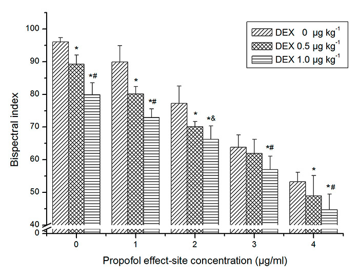 The effects of dexmedetomedine on bispectral index at every propofol effect-site concentration. Bars represent mean ± SD. * Significant differences compared with control group at the same propofol effect-site concentration (p <0.01). #Significant differences between dexmedetomidine (DEX) 0.5 and 1.0 μg kg–1 (p <0.01). &Significant differences between dexmedetomidine 0.5 and 1.0 μg kg–1 (p <0.05).