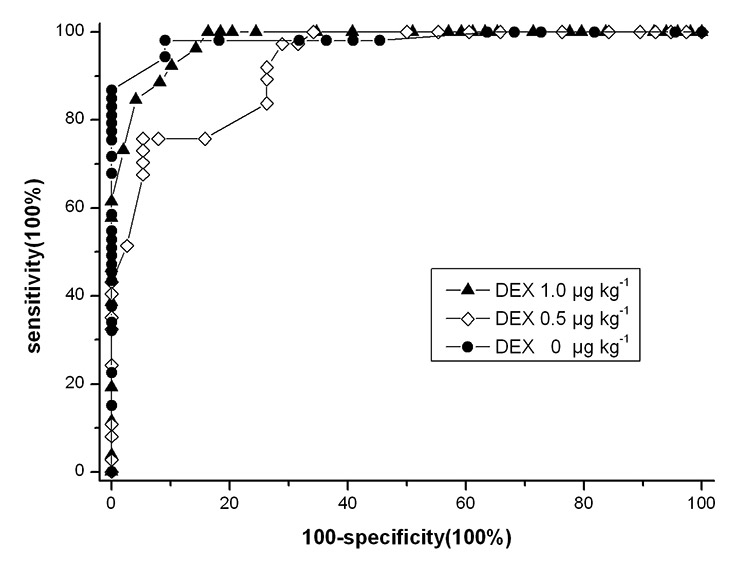 Receiver operating characteristic (ROC) curve for loss of consciousness detected by BIS. (DEX = dexmedetomidine.)