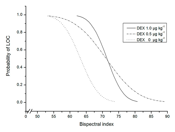 The relationship between the probability of loss of consciousness (LOC) and the bispectral index. (DEX = dexmedetomidine.)