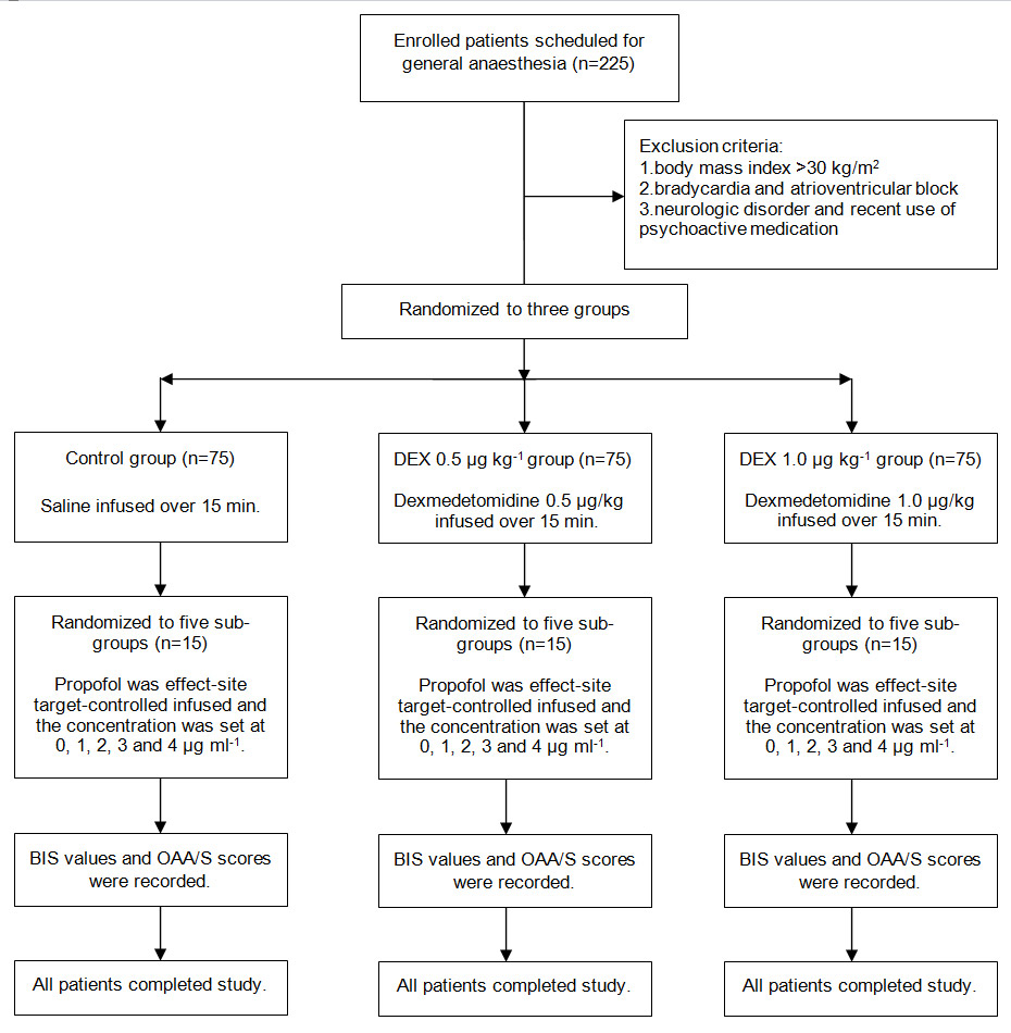 The study was approved by the ethics committee of the Affiliated People’s Hospital of Jiangsu. Written informed consent was obtained from 225 patients with ASAⅠor Ⅱ, aged 20–50 years and weighing 41–68 kg, who were scheduled for general anaesthesia. Exclusion criteria included body mass index >30 kg/m2, bradycardia, atrioventricular block, neurologic disorder and recent use of psychoactive medication, including alcohol.