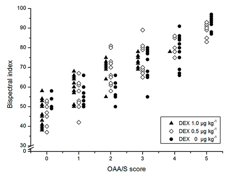 Raw data for the bispectral index at every Observer’s Assessment of Alertness/Sedation Scale score. (DEX = dexmedetomidine.)