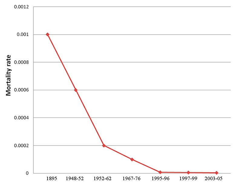 The study of anaesthesia-related mortality, as this outcome has been systematically analysed since the early beginning of the specialty, provides an interesting example of the evolution of patient safety in anaesthesia. However, these figures need to be interpreted with caution as there are some methodological limitations to the analysis. The first is a wide variety of definitions of anaesthesia-related mortality. For some authors, this term includes mainly perioperative death to which human error on the part of the anaesthesia provider has contributed [12–13]. For others, anaesthesia-related mortality refers to all potential causes of deaths occurring during or following anaesthesia, including those associated with both anaesthetic and surgical factors [14–15]. There is also a lack of consensus about the overall period of time after anaesthesia that defines anaesthetic mortality. Depending on the study, this period can vary from 24 hours to 30 days after an anaesthetic procedure. As a result, there is some controversy about the extent of improvement made by the specialty [16–17]. However, the historical analysis of the incidence of anaesthesia-related mortality, defined as patients dying under or following the care of an anaesthetist, provides compelling figures.