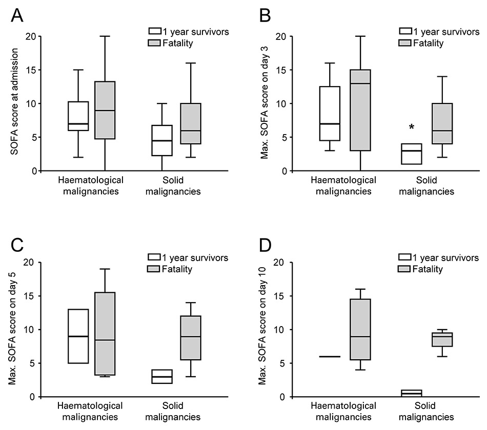 Admission SOFA scores and maximal SOFA scores obtained on day 3, 5 and 10 were stratified by the type of malignancy and survival status at one year. Data are given as box plots (showing median, line; central 50%, box and 2.5 and 97.5 percentile, whiskers) with individual panels for the day of admission (A), day 3 (B), 5 (C) and 10 (D) on the ICU. Parametric ANOVA on ranks revealed group differences of p= 0.008 (B) and p= 0.044 (C) with * significant post hoc group comparison (Bonferroni) at the p= 0.05 level.