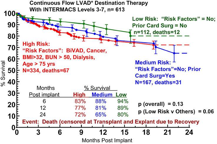 Actuarial survival after continuous-flow device destination therapy of patients with INTERMACS levels 3-7, stratified by high-, medium-, and low-risk patients. INTERMACS, Interagency Registry for Mechanically Assisted Circulatory Support; LVAD, left ventricular assist device. From: Kirklin JK, Naftel DC, Pagani FD, Kormos RL, Stevenson L, et al. Long-term mechanical circulatory support (destination therapy): On track to compete with heart transplantation? J Thorac Cardiovasc Surg. 2012;144:584‒603. © 2012 Elsevier. Reprinted with kind permission.