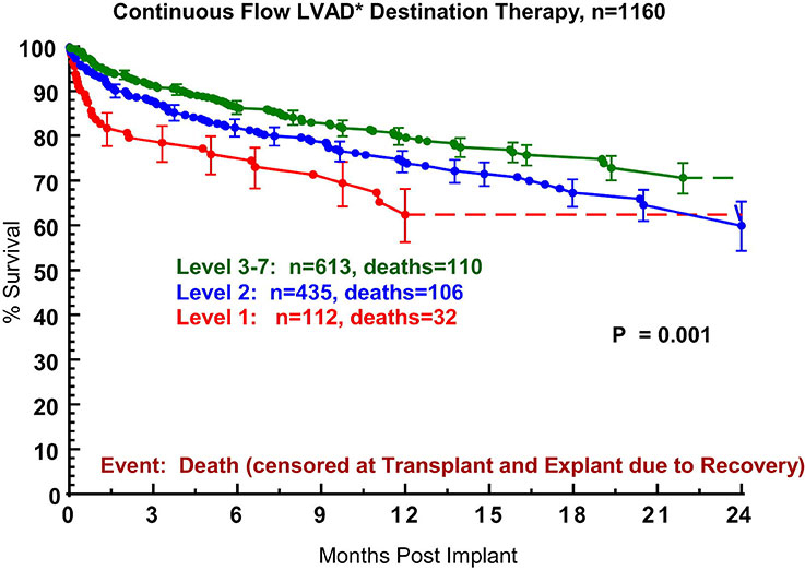 Actuarial survival after continuous-flow device destination therapy, stratified by INTERMACS level at the time of implant. INTERMACS, Interagency Registry for Mechanically Assisted Circulatory Support [20]. From: Kirklin JK, Naftel DC, Pagani FD, Kormos RL, Stevenson L, et al. Long-term mechanical circulatory support (destination therapy): On track to compete with heart transplantation? J Thorac Cardiovasc Surg. 2012;144:584‒603. © 2012 Elsevier. Reprinted with kind permission.