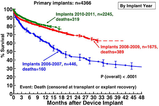 Actuarial survival following ventricular assist device implantation, stratified by era. From: Kirklin JK, Naftel DC, Kormos RL, Stevenson LW, Pagani FD, et al. The Fourth INTERMACS Annual Report: 4,000 implants and counting. J Heart Lung Transplant 2012;31:117–26. © 2012 Elsevier. Reprinted with kind permission.