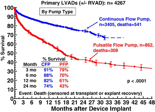 Actuarial survival following implantation of continuous-flow (CFP) versus pulsatileflow pumps (PFP). From: Kirklin JK, Naftel DC, Kormos RL, Stevenson LW, Pagani FD, et al. The Fourth INTERMACS Annual Report: 4,000 implants and counting. J Heart Lung Transplant 2012;31:117–26. © 2012 Elsevier. Reprinted with kind permission.