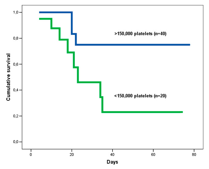 In-hospital mortality was 20% (n = 12): 5% (n = 3) died from multiorgan failure and 15% (n = 9) patients from hypoxic respiratory failure. The variables recorded during ICU admission and univariate analysis are shown in table 1. The maximum time from illness onset to hospital admission, and time to first dose of antiviral delivery, was 48h. When data from survivors and non-survivors were compared, univariate analysis revealed significant differences in BMI, creatinine, haemoglobin, platelets, arterial pH, pCO2, and the rate of bacterial coinfection. There was no increase in mortality with greater BMI. In fact, patients with a BMI >25 kg/m2 had a better survival rate (90.6% vs 71.4%; Log Rank = 0.04); obese patients (BMI >30 kg/m2) had a 100% survival rate, compared with 80% among the overweight (25–30 kg/m2) and 70.4% in normal BMI (Log Rank = 0.019). Variables during follow-up were not included in the analysis. In the multivariate analysis, the presence of lower platelet count was statistically significant for in-hospital mortality (see table 2). Patients with thrombocytopenia at admission showed a lower survival rate (55% vs 92.5%; Log Rank = 0.008) (see fig. 1).