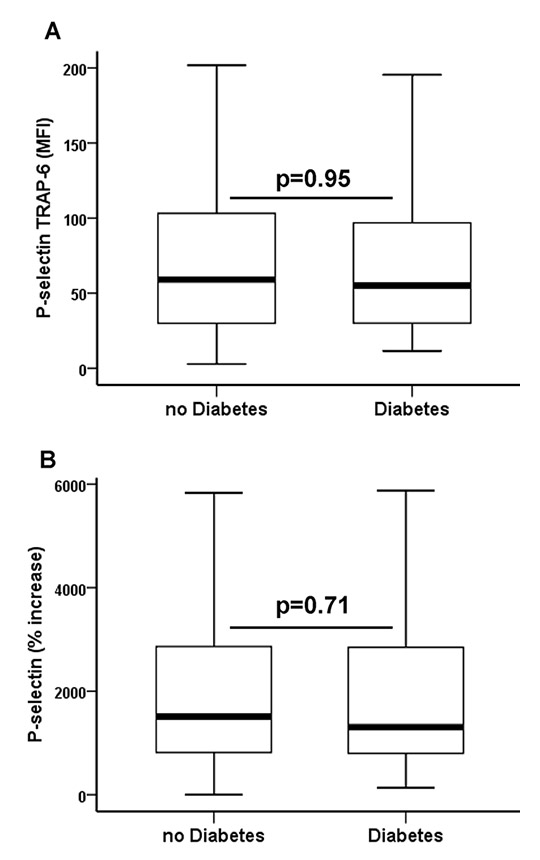 (A)Thrombin receptor activating peptide-6 (TRAP-6) inducible P-selectin (P-selectin TRAP-6) and (B) relative increase of platelet P-selectin (% increase) after activation with TRAP-6 in patients with coronary artery disease without and with type 2 diabetes. The boundaries of the box show the lower and upper quartiles of data, the line inside the box represents the median. Whiskers are drawn from the edge of the box to the highest and lowest values that are outside the box but within 1.5 times the box length. MFI = mean fluorescence intensity.