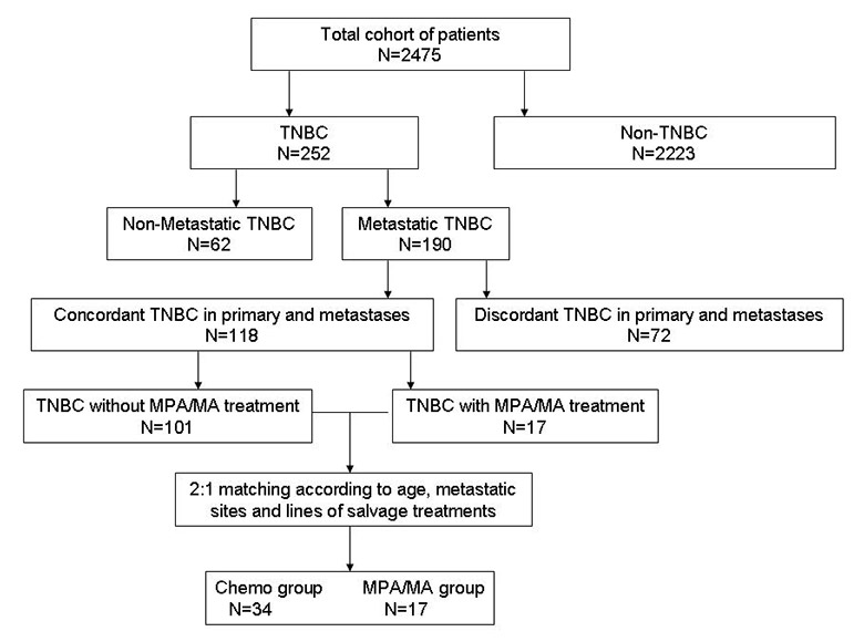 In this cohort, 252 patients had been diagnosed with primary TNBC, and metastases were diagnosed in 190 of these patients. Triple-negative tumours were diagnosed at primary and metastatic sites in 118 patients. Only 17 patients with TNBC who received progestin (MPA/MA) treatment were included in our database. To create a statistical model in which patients in the MPA/MA and chemotherapy groups were matched at a 1:2 ratio according to age, metastatic sites, and lines of salvage treatment, we selected 34/101 patients in the database who had undergone chemotherapy for inclusion in this study. We believe that the use of this model is more effective than analysis using an unselected model. A flow chart of the cohort is presented in figure 1.