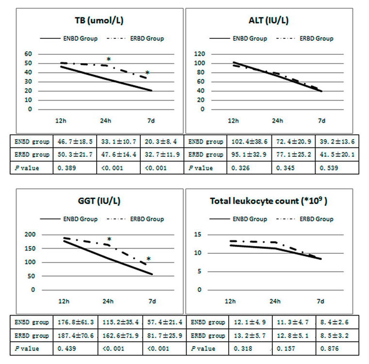 ALT = alanine aminotransferase; AST = aspartate aminotransferase; ENBD = endoscopic nasobiliary drainage; ERBD = endoscopic retrobiliary drainage; ERCP = endoscopic retrograde cholangiopancreatography; GGT = gamma-glutamyltransferase |