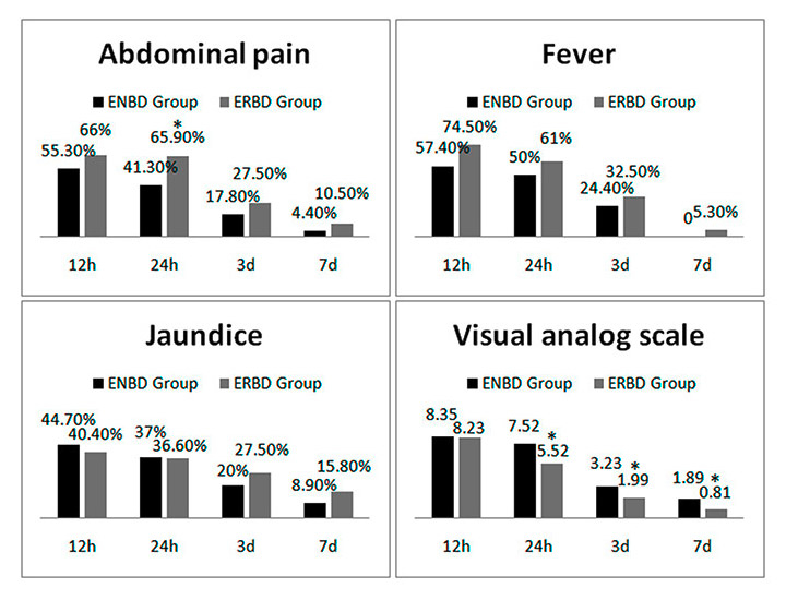 Rates of abdominal pain, fever and jaundice 12 hours, 24 hours, 3 days and 7 days after endoscopic retrograde cholangiopancreatography in the endoscopic nasobiliary drainage (ENBD) and endoscopic retrobiliary drainage (ERBD) groups.