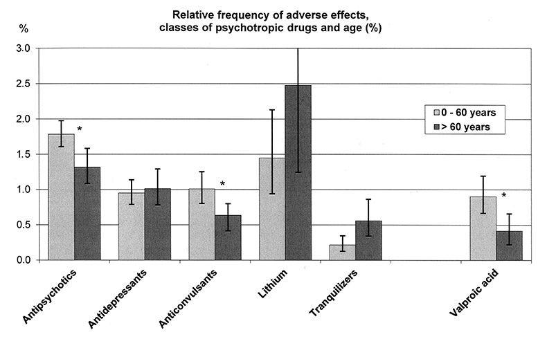 The overall consensus is that elderly psychiatric patients are more prone to develop adverse drug reactions (ADRs) than younger patients as a consequence of psychopharmacological medication [1]. This is described in special guidelines on the use of antipsychotics [2] (especially concerning cardiovascular accidents) and of anticonvulsants [3] in the elderly. However, actual scientific data on the frequency of ADRs in relation to age are rather sparse.