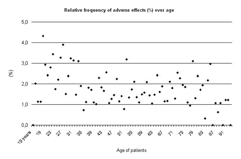 1. Logistic regression: To analyse the relationship between the relative frequency of ADRs and age, the relative frequency of ADRs for each year of age (15 years – 93 years) of the patients was plotted against age, and logistic regression and cross table analyses were calculated. Linear regression was used for the analysis of the relation of doses of drugs and age.