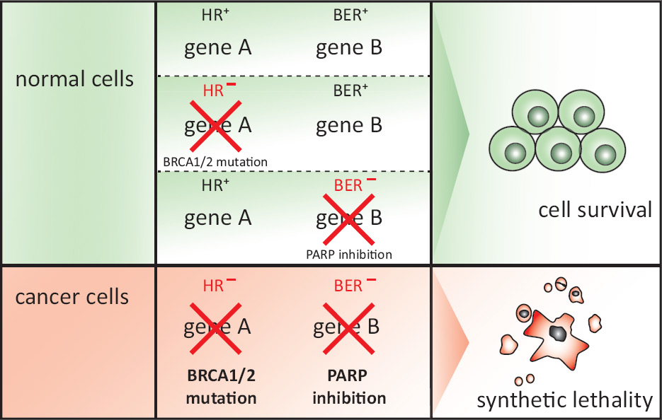Synthetic lethality is defined as a combination of mutations or perturbations in two or more genes that leads to cell death, whereas inactivation of any one of the genes alone does not. Perturbation of genes can occur through genetic mutation or silencing, depletion by RNAi or inhibition by SMIs and is depicted by a red cross. If genes that are essential for a certain DNA repair pathway (e.g. gene A) are inactivated in normal cells, alternative pathways with functional genes (e.g. gene B) are utilised to respond to DNA damage. Conversely, cancer cells mutated or silenced for a component of a DDR pathway are compromised in their ability to process DSBs. These cells then rely on alternative DNA repair pathways to repair the breaks. Therefore, inhibition of the alternative pathway will cause cell death due to persisting DSBs. Please refer to main text for details about the example given for synthetic lethality between BRCA1/2 mutation and PARP inhibition.