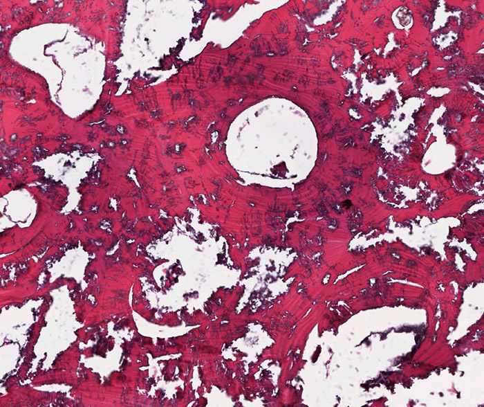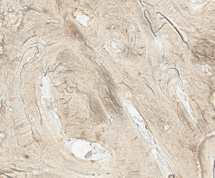 Histomorphological analysis revealed mature, structured lamellar bone without indication of an associated immature or fibrous component. The bone lesion is dense and without evidence of lytic areas. Although viable cellular components, which could have shown signs of nuclear atypia, could not be demonstrated, the mature architecture of the remnant bone structures do not raise the suspicion of malignancy.